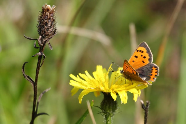I mentioned that Castle Hill is a haven for butterflies. There were several meadow browns, and a red admiral flew past; but the photo is of one I'd not seen before. It's a small copper; and technically, that's two 'firsts' in one day.