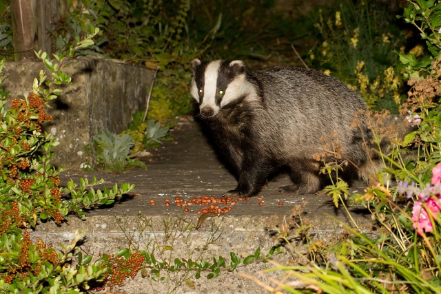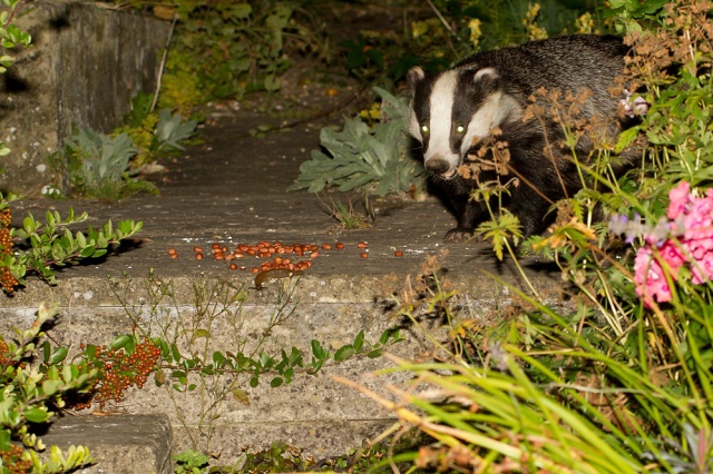 The badger retreated and I didn't see it again. They avoided each other this time, but that's not always the case. Here's some footage from a night or so ago.