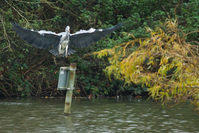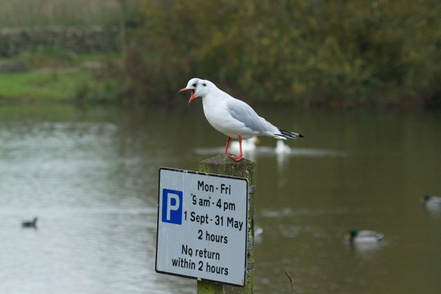 19 Nov 2012dW, well done Sherlock! Two different signs. The heron is landing on a 'no fishing' sign on the far side of the pond from where the parking sign is (and the parking sign is indeed on land… just). :sherlock: