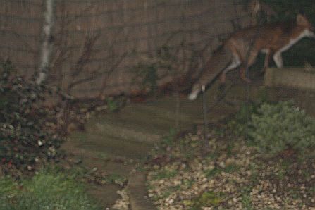 Well I nearly photographed a fox last night. I was at the rear of the garden when the young male fox appeared over the garden fence. Quick as a flash I got my new camera out, pointed the lens and… aaargh.. it wouldn't focus, when the flash fired it failed to light the shot, and I ended up with three very out of focus images with about half a fox in each. This is the best of them.