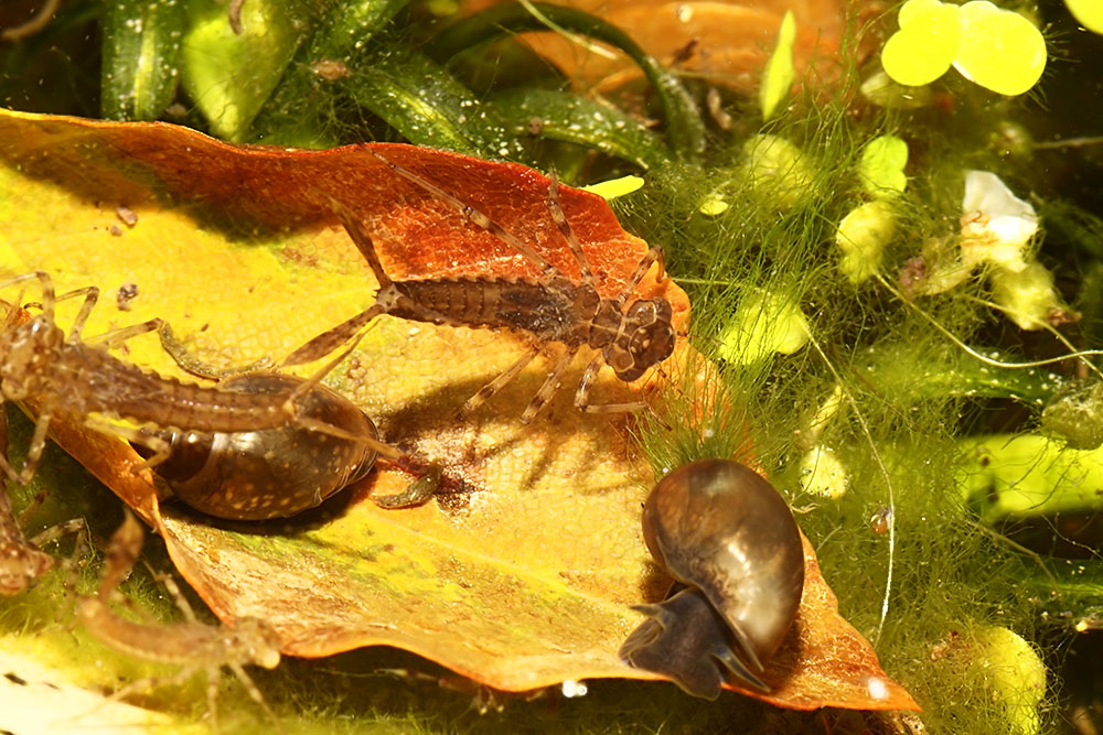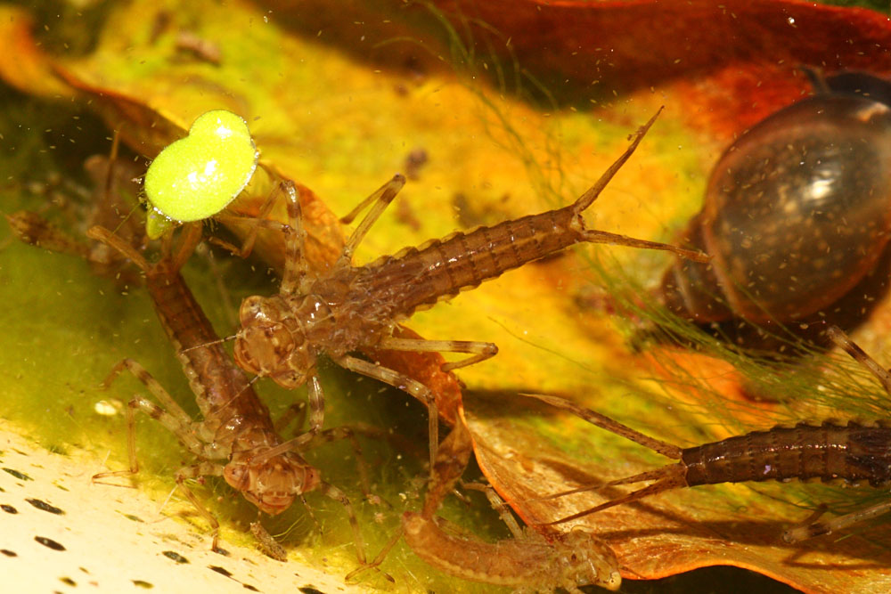 A day of continual rain resulted in very few photographic opportunities, but once again things improved after dark. I wasn't treated to a hedgehog or fox this time, and the frogs were conspicuous by their absence. In fact I thought I wasn't going to see anything worth photographing. That is until I noticed some small creatures at one end of the garden pond. There was a group of them, and they weren't young newts. Close inspection revealed a small colony of damselfly nymphs.