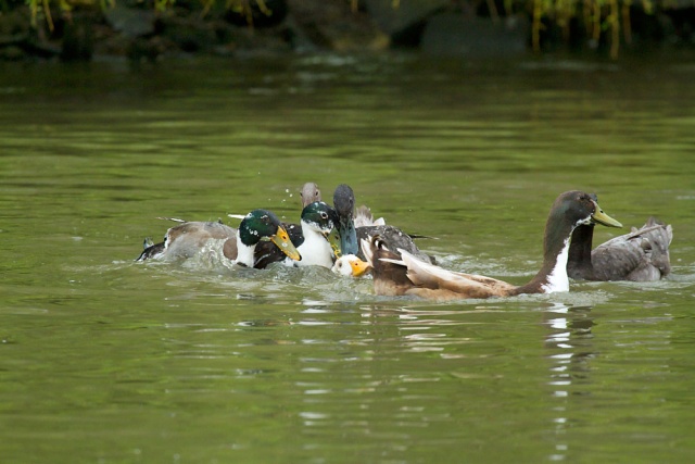 The ducks are altogether more complicated. There are plenty of wild mallards on the pond, but they've been joined over the years by numerous domestic fowl including the running ducks and white ducks. And it was these feral-domestic birds that feature in the next photo: six persistent drakes and a female white duck (her head is just above the water in this shot). This is very typical duck behaviour.