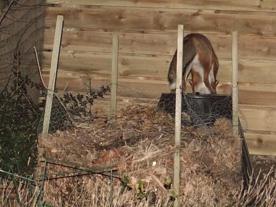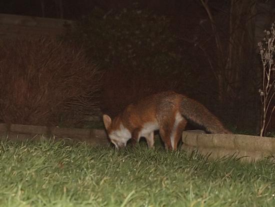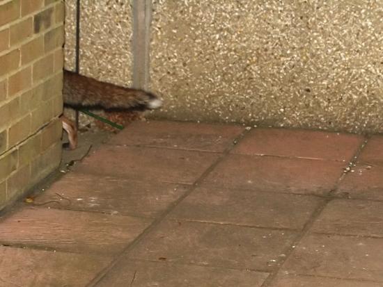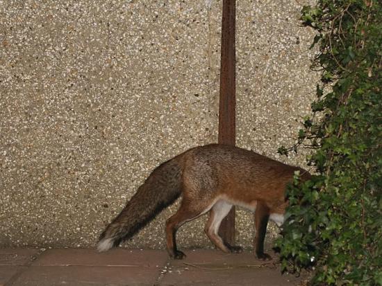 No sign of the old fox, but the young male showed up a little while ago and did his best to play hard to get (or at least hard to photograph). I was by the back door when he showed up, emerging from the side of the house.