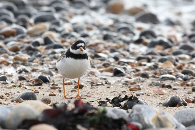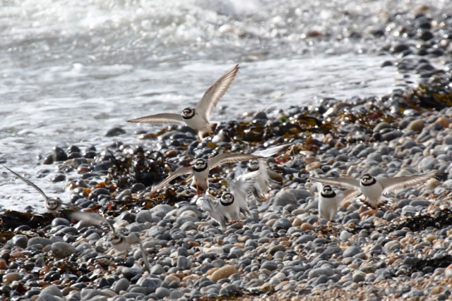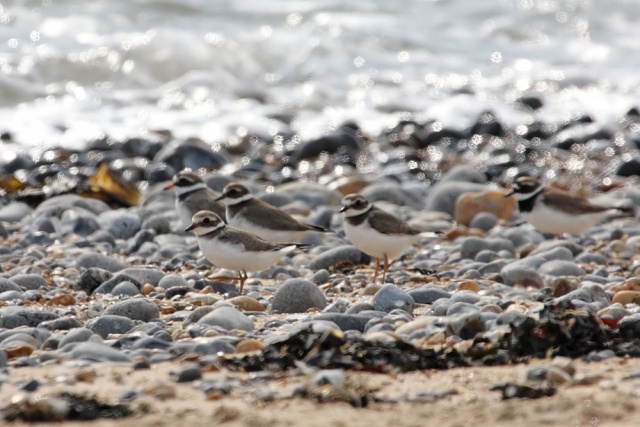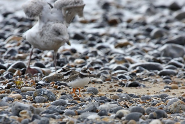 There was just one grey, but countless ringed plovers. They merge perfectly with the pebble beach, and can be incredibly difficult to spot from a distance. These are juveniles (I'm basing the identification on the white stripe above the eye… they are very similar to the 'little ringed plover'. Ringed plovers (juveniles)