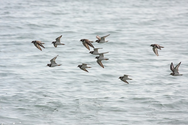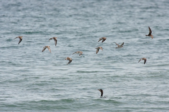 There seems to be a running theme in recent posts of birds flocking. Well the plovers have clearly been following this blog, and on several occasions took to the air for a quick circuit. A passing cormorant stops to watch as they fly past