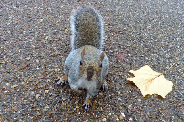 After the brief spell of sunshine, the rain returned with a vengeance today, accompanied by an icy wind. But never let it be said that I'm not intrepid! (I'm not, but never say it 😉 ) and I did stretch my legs at lunchtime, though not beyond the entrance to the park. Several squirrels (what else) were busy feeding up for winter, and as curious (or hopeful for food) as ever. I disappointed them, but still got the shot.