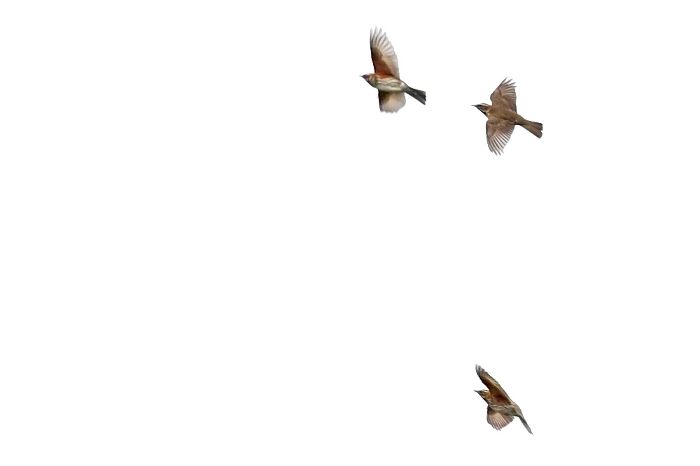 The shot has had a bit of a working over in Photoshop. The levels have been adjusted to bring out the colour, some noise reduction has been applied, and the final image brightened. The three birds helpfully display most of the key characteristics of the redwing, including the reddish underwing and the brown upper wing, and the mottled breast on the lower of the three birds. The distinctive stripe above the eye is also shown. The grouping is typical. There's another shot here.