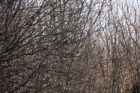 It was misty this morning, and I was working through lunch. So it wasn't until I was leaving work that I had even a sniff of a photo. And even then I had made it to the car, had put the camera inside, and was about to get in for the drive home when I spotted something in the corner of my eye. It was flying low along the trees at the edge of the car park, and the pattern of flying looked wrong for the ubiquitous wood pigeons. It settled some distance away. Out came the camera, and peering into the distance I could just make out this: