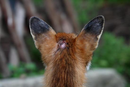I guess Roofy might have been scratching the affected area? I read that moose in Algonquin sometimes get vast numbers of ticks, enough to cause anemia, but I haven't heard of that happening to a fox. Strange though.
