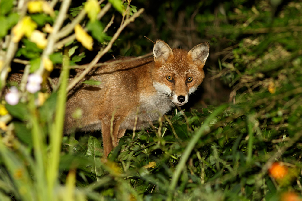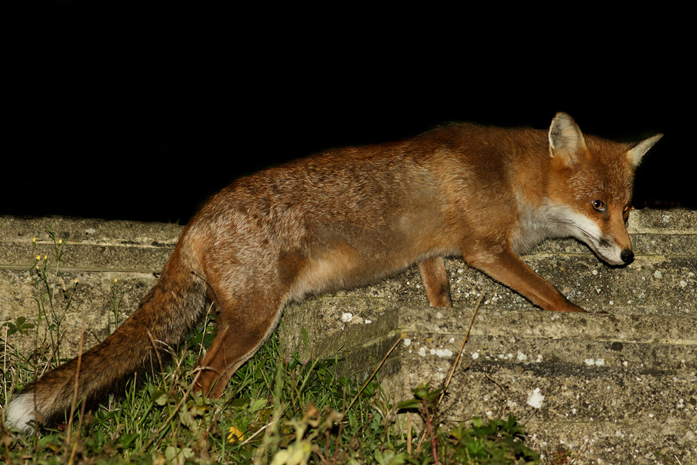 That’s the limit (9.5m) of how close the dog fox will allow me to approach. We’ve been playing this game of distances for several weeks now and it seems to be remarkably fixed. Where he has become more tolerant is that he’ll let me get that close even when food isn’t in the immediate vicinity. I’m still some very long way from being able to pose him where I would like (I have managed that with other foxes), but I am now achieving photos other than ones of him tucking in. Here’s a selection from the past week.