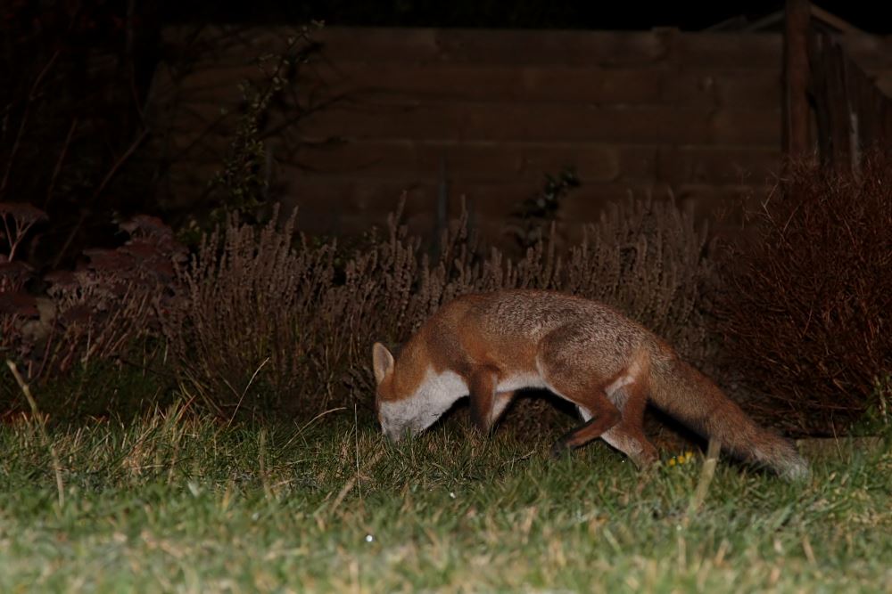 I did slightly better tonight though. The old dog fox showed up again, for the first time in just under a week. He didn't stay long, but at least he trots sedately rather than hightailing it out of the garden when I approach with a camera. He was even thoughtful enough to position himself so that I could more or less get his head in this shot!