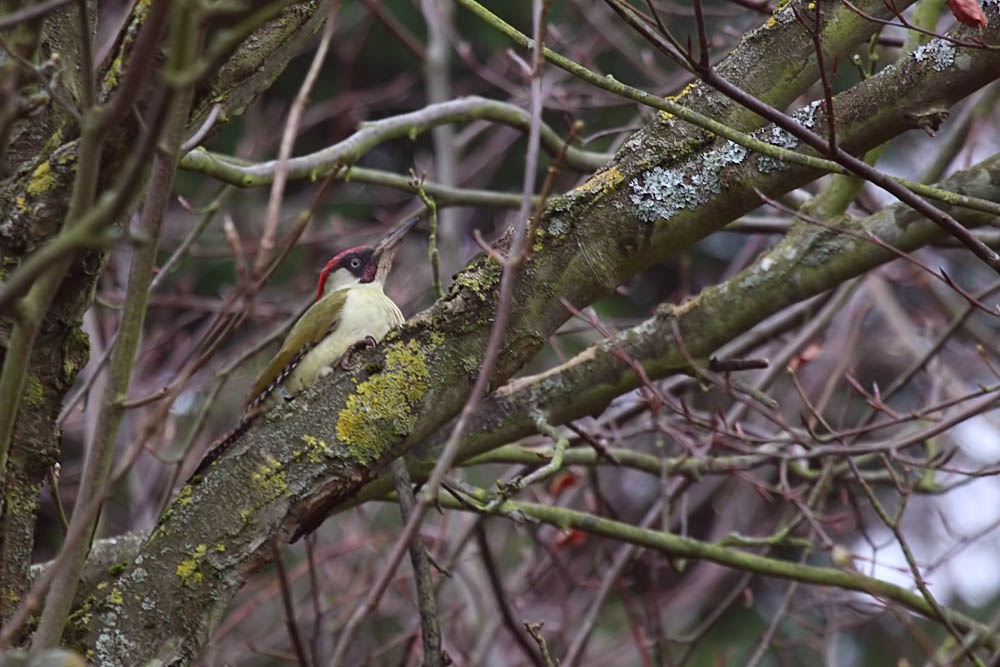 The nearest to any brightness today came with a few frames of a green woodpecker. It must have been feeling the cold. It let me venture somewhat closer than usual (and switch lenses) before flitting away.