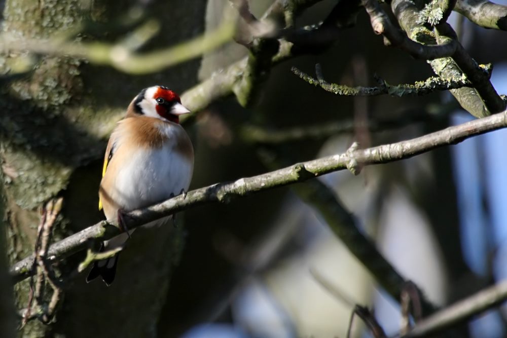 Glorious blue skies today, and great light. These are the kind of conditions I like. It wasn't too cold either. I didn't venture too far today, but was delighted to stumble across a goldfinch preening itself. I don't think I've ever seen one in our garden, but they are a fairly common sight out on the edge of the fields. These shots were all taken from a good distance away, and it was moderately high in the tree. But at least I could get a clear line of sight. The first shot is uncropped.