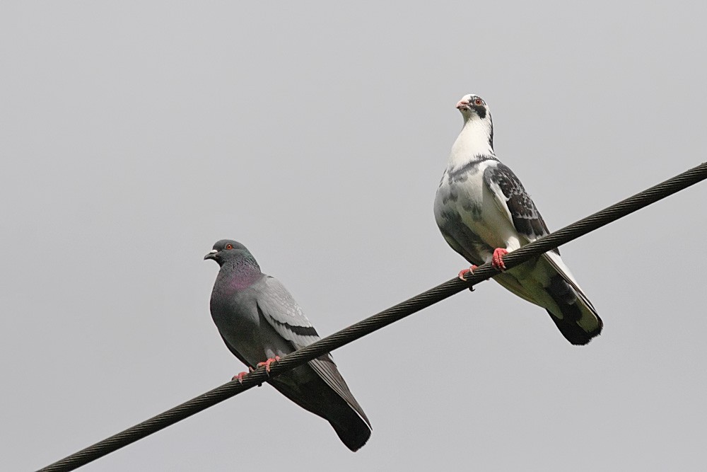 I was out early today, and had a couple of hours to kill while waiting for my car to be serviced. The early rain eventually gave way to some warm sunshine. During my wanderings on the outskirts of Uckfield I came across a small flock of pigeons, one of which was a beautiful piebald.