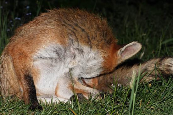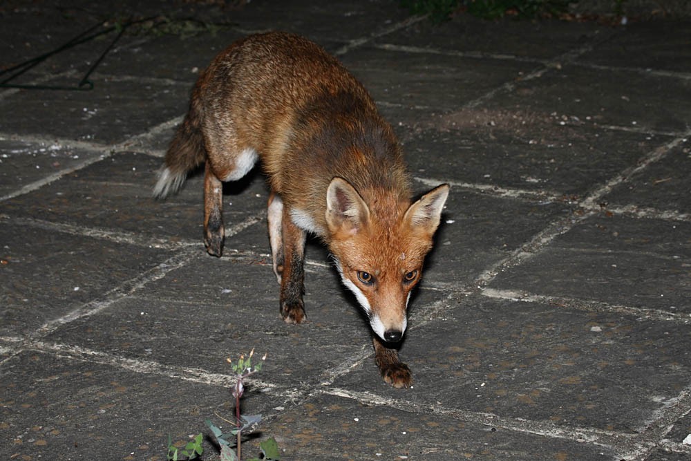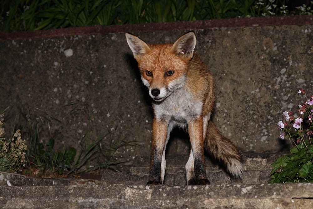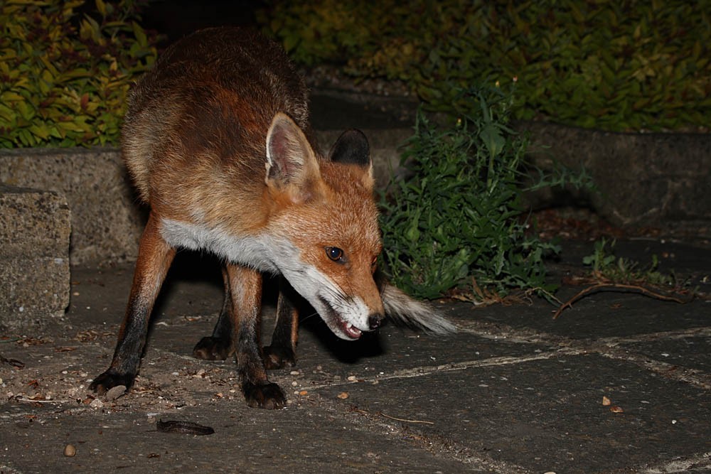 This evening was a series of visits, starting with the dog fox. He caught me by surprise (I was at the rear of the garden looking for insect to photograph), but as ever he was happy to wander around, dig up previous caches, and pose for pictures.