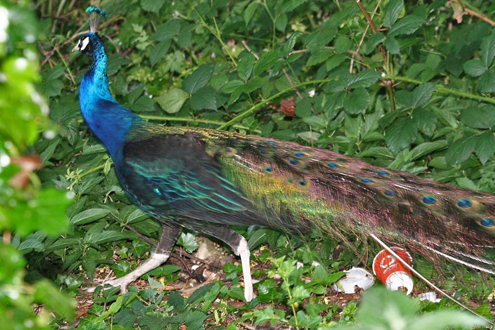 Yes, we seem to have acquired a stray peacock. He's surprisingly difficult to see. He emerges as far as the edge of the dense undergrowth. If he retreats back into the wood he disappears from sight almost instantly, despite his size and vivid colour. Most of the shots I fired off were unusable, but I did manage another this evening when I was leaving work.