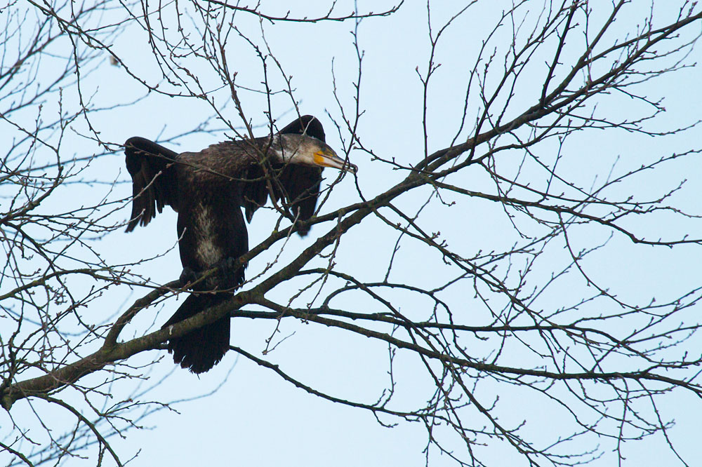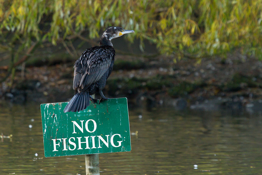 After last week’s fishing exploits, the cormorant seems to have taken heed of the signs and was back on his favoured perch this morning.
