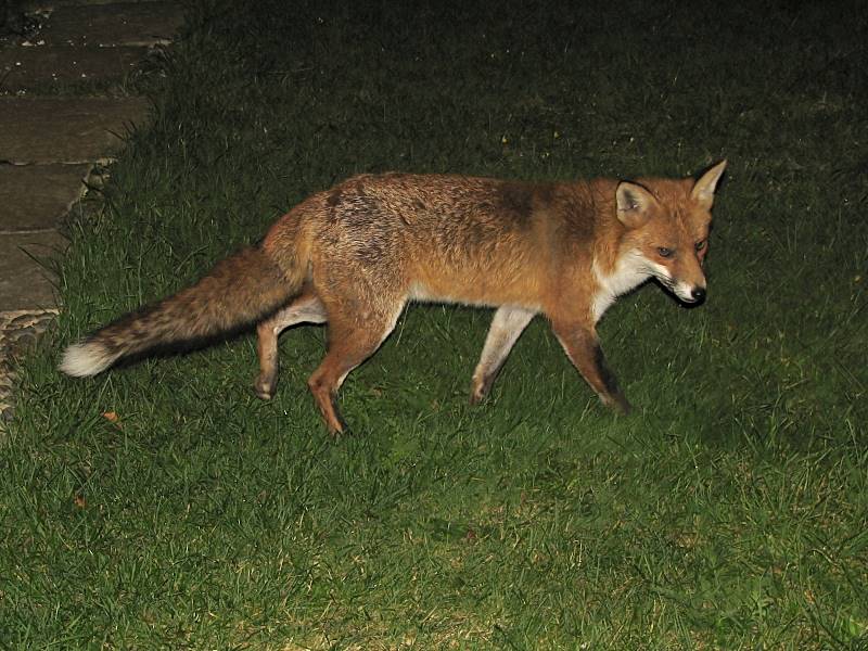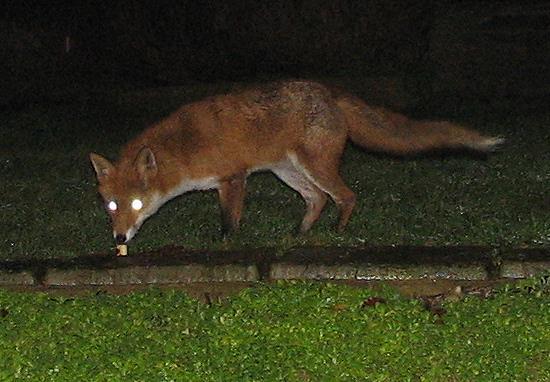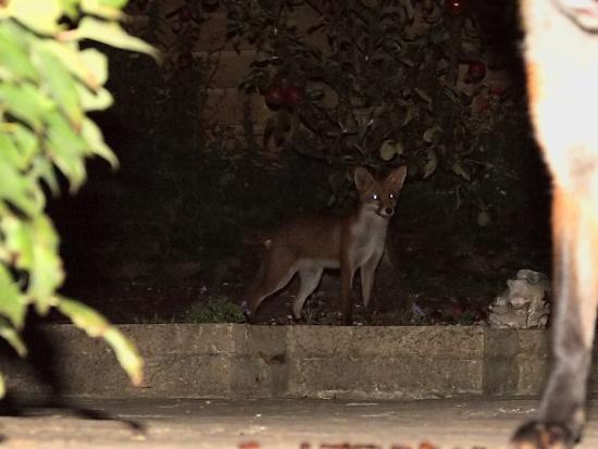After a week or so of relative calm in the garden (ie only brief sightings of the foxes), tonight was something of a break from the routine. The young regular cub was out this evening, and while I was taking some pictures I noticed a flash of coloured light in the camera viewfinder. It could only be one thing, and on looking closer I realized we had an audience.