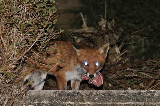 Having glimpsed the nicked-ear vixen last night I set up this evening in a determined attempt to photograph her. The lure was an egg. I hid myself away at the far end of the garden with a long lens and flash at the ready. After about 20 minutes I saw a face appear in the camera viewfinder. I managed one shot, and she was gone. It was when I looked closer that I saw why she's less than impressed with our garden.