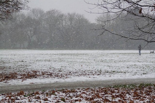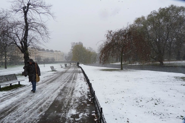 But the train did run. It was a little late (and so therefore was I), but the snow was light. Flurries which would run out of energy after a few minutes. The temperature was hovering around 0ΒΊ and what snow there was wasn't settling. This is lunchtime on Tuesday in Regent's Park.