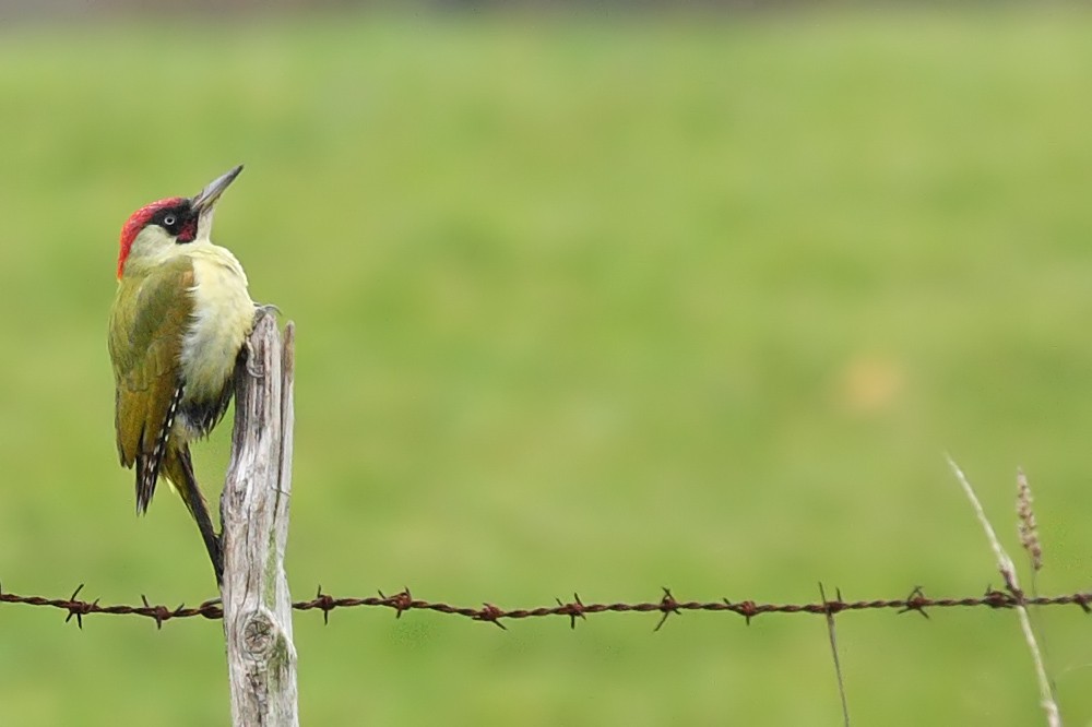 I first noticed it when it shot off into the distance, a blur of yellow-green. I lost sight of it for a while, but then spotted it flying into a small group of trees. As I approached it took the wing. I followed it to another group of trees. Off it shot, eventually coming to land on a nearby fence-post. By this time I was protected by the trees and was able to approach without being seen.